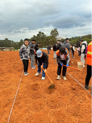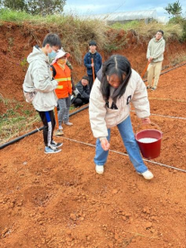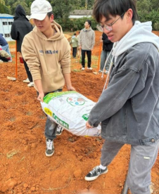 教学科研基地领取了种子、锄头、肥料、水桶等,接着开始拉线、松土、挖坑、施肥、播种、填土、浇水,完成了油菜花种子的播种,同学们专注地将一粒粒孕育着生命的种均匀地播撒在基地的土壤里,虽然天气开始大降温,但是瑟瑟的寒风抵挡不住同学们劳动的热情。田地里一派热火朝天的劳动景象,加油鼓劲声此起彼伏。同学们一开始还会因力度掌控不到位而导致没有将土坑挖好,又或是埋头苦干半天,一回首就忘记留田间便道,但随着时间的推移,取而代之的是农田中一片井然有序的景象。