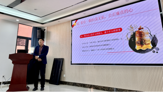 党委书记王国贤在五楼会议室给全体教师党员讲授了一台生动的廉政党课。