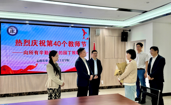 王爱平书记代表学校向王立娜老师致以亲切的节日问候,对王博士扎根云农,立德树人,躬耕三尺讲台,为学校发展作出的贡献表示感谢,并为她献上鲜花和节日祝福。在轻松欢乐的气氛中,各位领导和王立娜博士亲切交谈,关心了解她的工作、学习、生活等情况,并认真听取了王博士对学校改革发展的意见和建议。王爱平书记表示,学校高度重视人才工作,努力为博士教师营造安心工作、干事创业的良好环境,希望王博士利用自身优势,继续做好青年教师表率,在教书育人的工作中继续创造佳绩,与学校共成长、同发展。