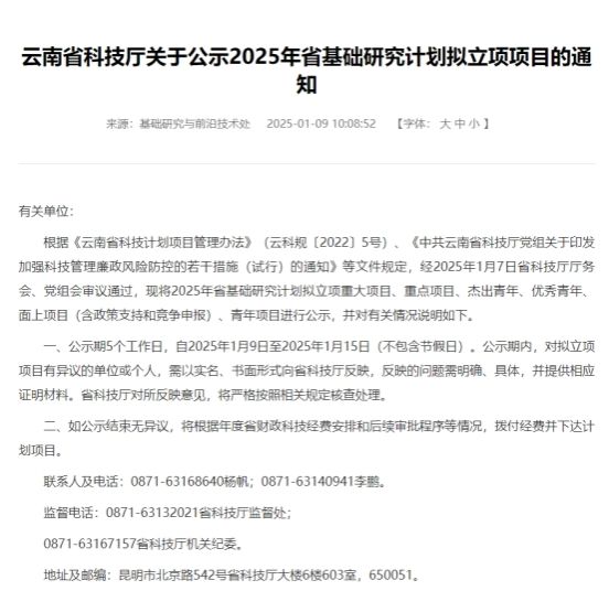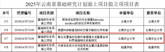 近日,云南省科技厅发布了“2025年度云南省基础研究计划项目拟立项名单”,七彩直播 张玉波、桂婉妹两位教师分别获得云南省基础研究计划面上项目及面上政策类支持项目。