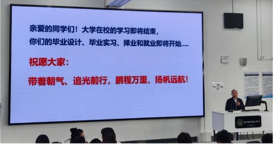 杨继清副院长详细介绍了毕业设计流程、基本要求、查重和AIGC 检测、抽检、成绩评定、优秀毕业论文(设计)遴选、毕业答辩等要求,同时强调了毕业实习期间的安全管理要求,从施工现场安全、交通出行安全、个人防护措施等方面进行了详细讲解,并结合近年来高校毕业实践环节中的典型安全事故案例,提醒同学们务必提高安全防范意识,严格遵守学校和企业的安全管理规定,要求提交外出实习个人申请表、用人单位接收实习生回执单、七彩直播