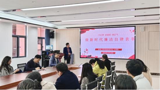 王书记以“守纪律、讲规矩、扬正气——做新时代廉洁自律表率”为题,围绕廉洁自律和做人做事,要求全体教师党员要始终铭记新时代高校教师的神圣职责,树立正确的世界观、人生观、价值观,胸怀一颗坦荡无私、公正廉直的心,自觉做守纪律、讲规矩的表率,努力营造政风清明、校风清净、教风清正、学风清新的良好氛围。