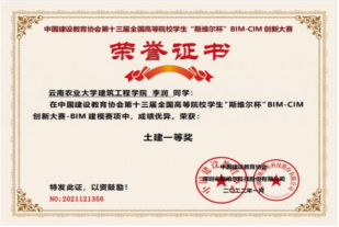 2019级工程造价班全班72人,平均绩点2.80;其中86%学生均在2.0以上。共有26名同学通过英语四级考试,通过率达36.62%,3名同学通过英语六级考试。近三年来,在学科专业竞赛创新创业大赛和文化体育比赛中省级以上各类获奖超过40项。在全国大学生“互联网+”大赛中获省级金奖1项、银奖5项、铜奖9项;云南省“挑战杯”学生课外学术科技作品竞赛二等奖2项;在全国建设类院校BIM数字工程技能创新大赛全国总决赛特等奖3项、一等奖3项、二等奖4项;第十三届全国高等院校学生“斯维尔”BIM-CIM创新大赛一等奖3项;在大学生创新创业训练计划中国家级立项2项、省级立项1项;第十届全国高等院校建筑软件认证大赛GTJ 云南省前三甲1项;云南省全过程数字工程技能创新大赛二等奖3项;全国第六届青年摄影大赛优秀作品奖1项;东方财富杯国家赛优秀奖1项;同时发表论文3篇及计算机软著5项。总计各类获奖证书数量超过150余份。全班就业率80.28%,9名党员100%高质量就业,6名同学考研上岸,其中陈麟考入山东大学、钱梓滢考入浙江工业大学。
