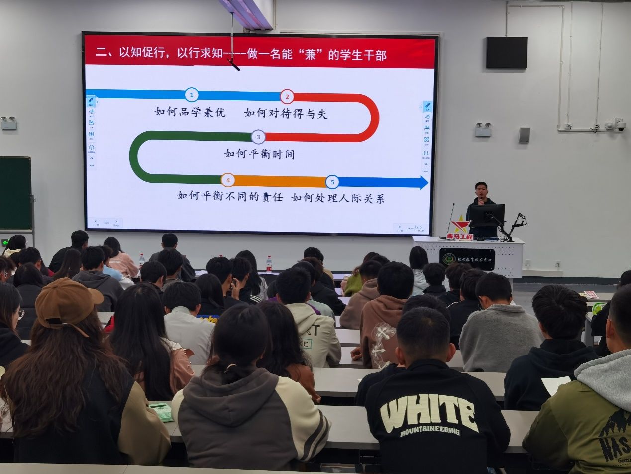 高质量发展做出应有的贡献”为主题,从党的二十大精神领学、新时代好青年的具体要求、学生干部应当培养的能力素质等内容展开详细讲述。号召学生干部要认真学习贯彻党的二十大精神,努力做到学深悟透、指导工作实践,工作中善于深入思考、勇于担当作为。