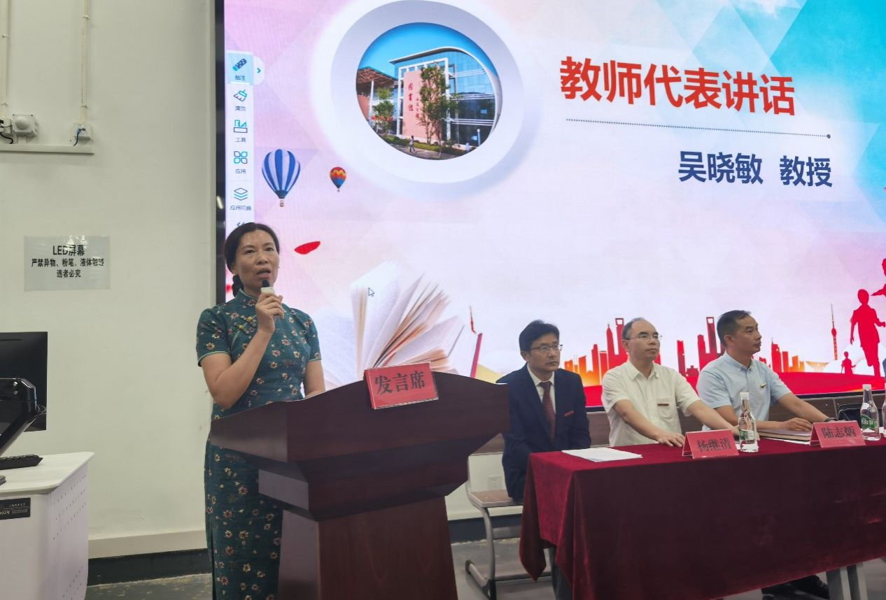 教师代表吴晓敏教授向全体新生致辞,她希望新同学要尽快转换角色,适应新环境;要树立好目标,合理规划大学生活;要走出宿舍,丰富拓展大学生活。希望新同学们怀揣梦想,不忘初心,砥砺前行,成就更优秀的自己。