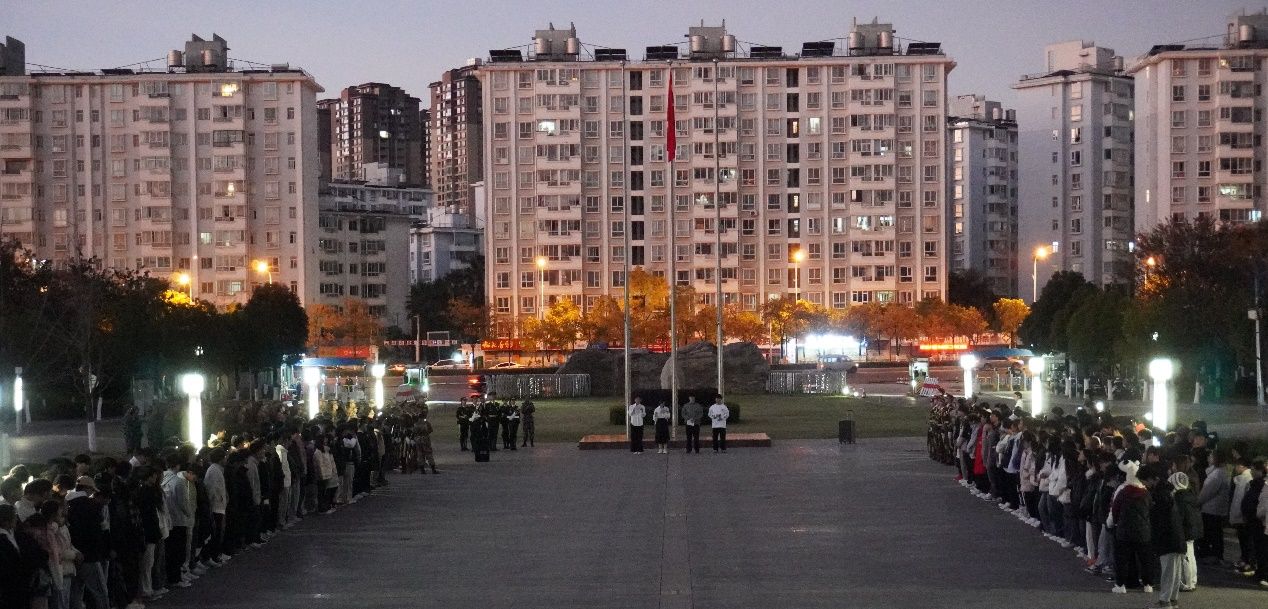 在曙光初现的清晨,尽管寒气逼人,但师生们的热情却如火焰般炽热。国旗护卫队以整齐划一的步伐、坚定的神情护卫着国旗走向升旗台,展现出青春的风采与力量。伴随着《义勇军进行曲》的激昂旋律,鲜艳的五星红旗在晨光中冉冉升起,全体师生面向国旗,肃立致敬,表达对祖国的无限热爱与崇高敬意。