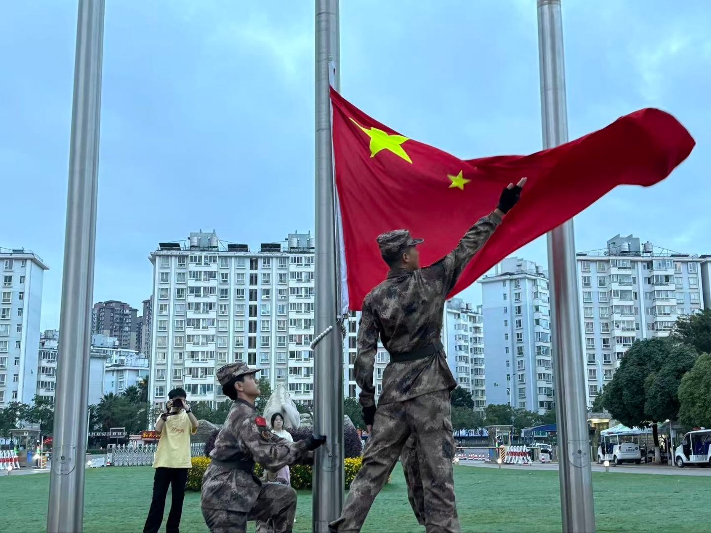 晨曦初绽,广场上气氛庄严肃穆。伴随着嘹亮的号令声,校军事爱好者协会队员身姿矫健,步伐整齐有力,护卫国旗入场。伴随着激昂的《义勇军进行曲》,五星红旗在晨光中冉冉升起,迎风飘扬。全体师生面向国旗肃立致敬,齐声高唱国歌,目光紧紧追随国旗,心中是对伟大祖国无限的热爱与崇高的敬意。