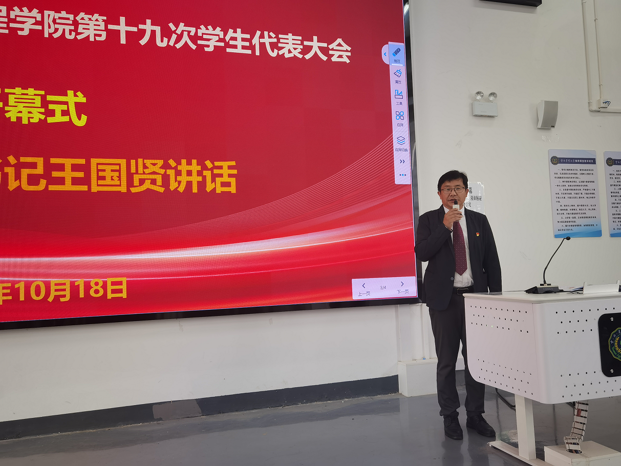 在雄壮的国歌声中,大会正式拉开帷幕。王国贤书记向大会顺利召开致辞,他充分肯定了院学生会过去一年在思想引领、组织建设、校园文化活动等方面的积极贡献给予充分肯定,对大会的召开表示热烈祝贺,对第十八届学生会的辛勤付出致以衷心感谢。王书记结合自身大学时担任学生干部的经历,鼓励同学们珍惜机会,勤奋学习,关心时事政治,树立大局意识,勇于担当。同时,要多倾听同学意见,当好七彩直播
