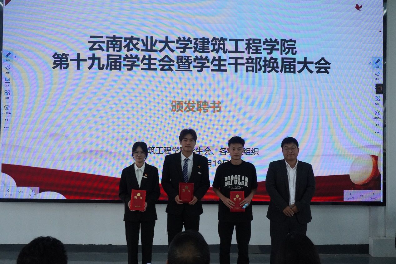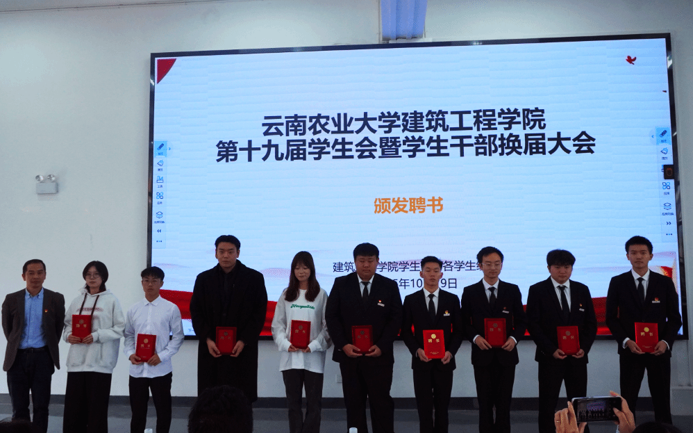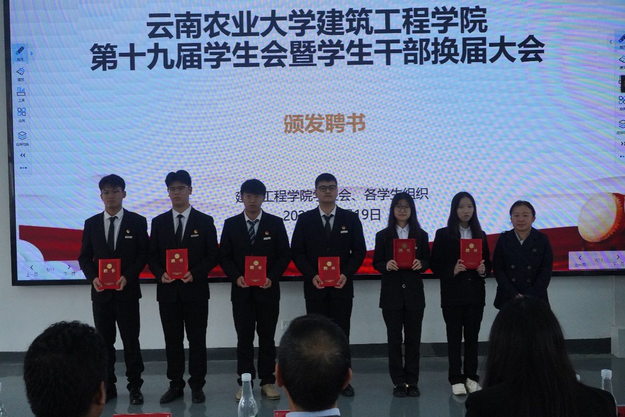 第十九届学生会、第二届院长助理、第二届艺术团、第三届就业与创新创业协会及各运动队的学生干部任职名单。在场领导和老师为新一届学生干部颁发了聘书。一份份聘书,既是荣誉的象征,更是责任的嘱托,在闪光灯的定格中,新老接力的使命感在会场中久久回荡。
