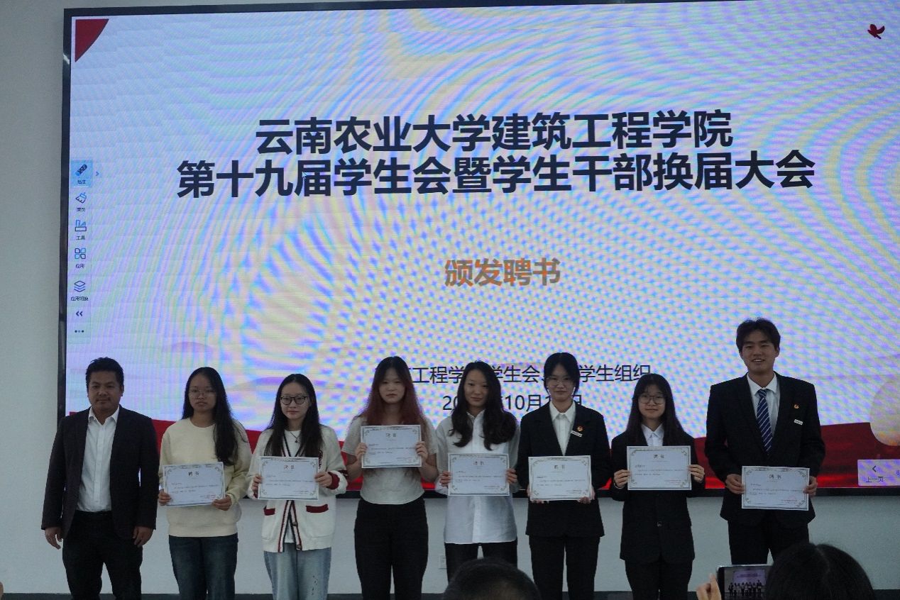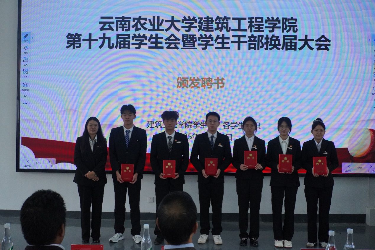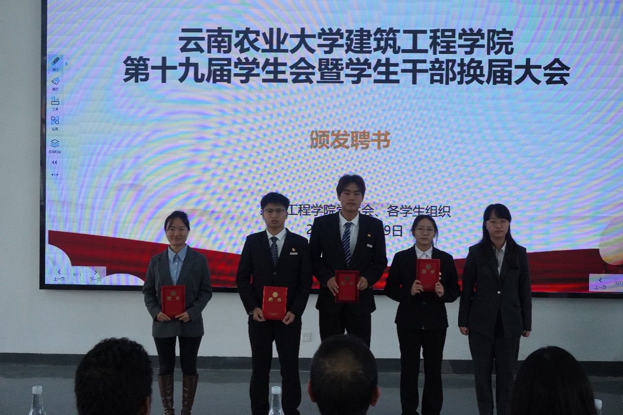 第十九届学生会、第二届院长助理、第二届艺术团、第三届就业与创新创业协会及各运动队的学生干部任职名单。在场领导和老师为新一届学生干部颁发了聘书。一份份聘书,既是荣誉的象征,更是责任的嘱托,在闪光灯的定格中,新老接力的使命感在会场中久久回荡。